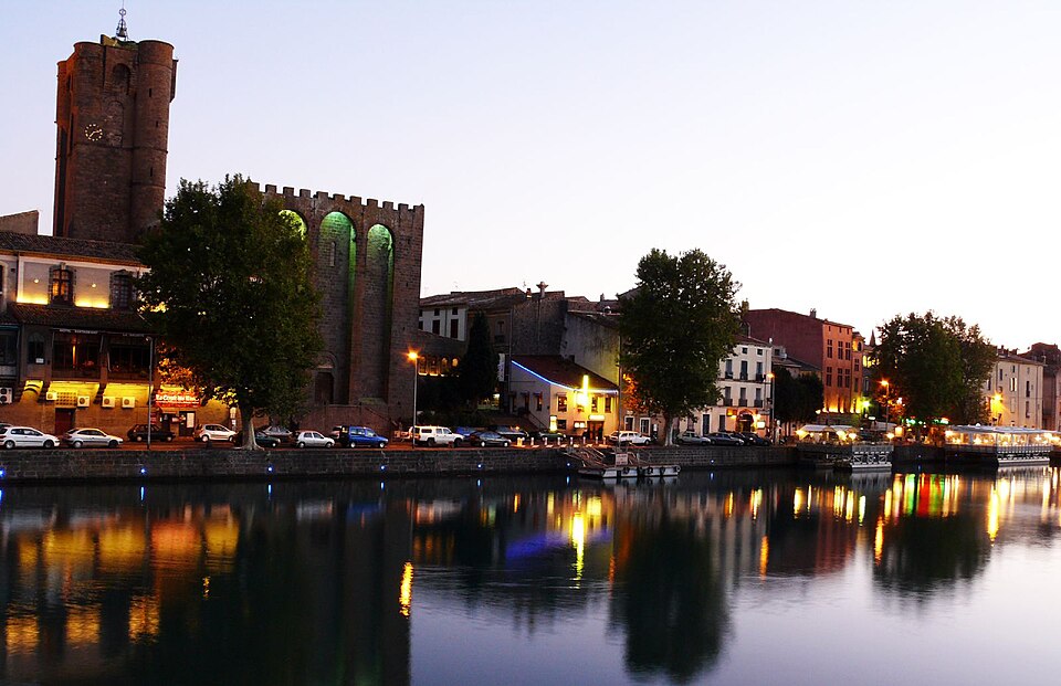 Français : Vue d'Agde au crépuscule (cathédrale Saint-Étienne et quais de l'Hérault)