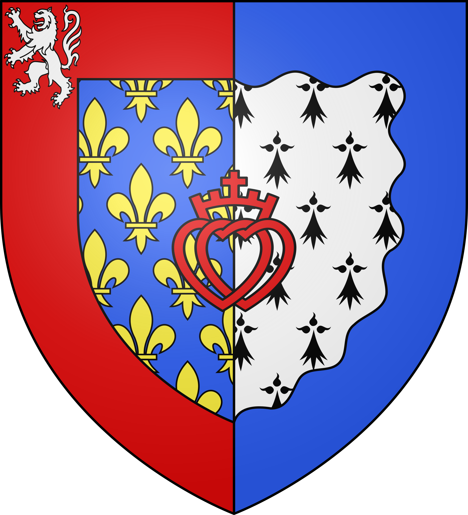 Français : mi-parti, au premier d'azur semé de fleurs de lys d'or à la bordure de gueules chargée en franc-canton d'un lion d'argent, au second d'hermine à la bordure ondée d'azur ; au double cœur vidé, couronné et croiseté de gueules, mis en abîme et brochant sur le tout